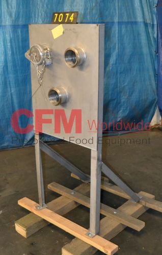 Stainless steel pipe manifold, (3) ea. 4" male I-line inlets, 28" wide x 57" tall, all stainless steel construction.