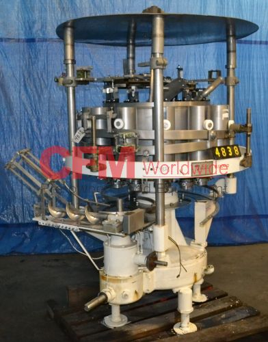 Votator model P-12-L twelve station rotary piston filler, 4-1/4" cylinders with a 5-1/2" stroke, 2" no-drip caps with 1-1/2" nozzle ports, valve stems have high pressure bowl sealing U-cups, can chute to infeed star, clockwise rotating bowl, tangential discharge, was last set on 401x411 size cans, pneumatic no-can-no-fill not mounted, filler can be quoted as described or with customers required change parts, stainless steel contact, mild steel frame.