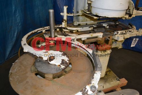 American Can Co. model 08 single head can closing machine, currently set on 603 x 700 can size, disc infeed, product topper post, automatic cover feed, mild steel construction, requires drive.
