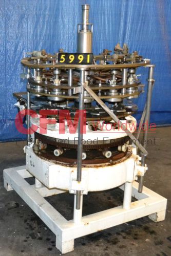 FMC 12 station rotary pressure/vacuum filler for 300 x 407 cans, conveyor to timing worm to star infeed, clockwise rotation, no-can-no-fill device, three stage vacuumizing and filling, top product inlet and bottom vacuum port, requires infeed timing worm, stainless steel contact, mild steel frame.
