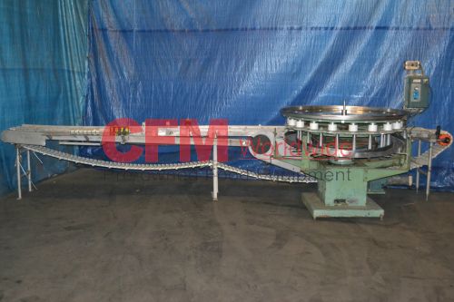 FMC 18 station volumetric pocket filler, serial number 4854-125-65, counter clockwise rotation, 54" diameter filler bowl, 2-3/4" diameter x 2-5/8" deep upper pockets, 2-7/8" diameter x 2-3/8" deep lower pockets, 2-1/2" tall additional outer PVC sleeve, 11.3 cubic inch to 22.0 cubic inch fill range, 5" wide product overflow catch pan, 45-1/2" product infeed height, "no can no fill", DC electric motor gearhead chain drive, non-standard 12" wide x 18' long thermoplastic table top conveyor, 1/2" tall x 10" wide cleats every 8", 33-1/2" conveyor infeed and discharge height, 14" wide x 39-1/2" long inspection table, chain driven by filler, Browning Manufacturing Division control panel, model MW25/75, part number 1251-1-33 wit, wired 115/1/60, available at 50 Hz, 9.78 amps, 3/4 HP maximum input, mild steel and stainless steel construction, stainless steel contact, requires product bowl brush and conveyor guide rails.