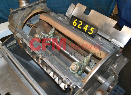 FMC model 50 pulper, 3" Tri-Clover pipe infeed, with four paddles, stainless steel and brass contact, mild steel frame, with guards, requires drive, no serial number, cleaned and painted.