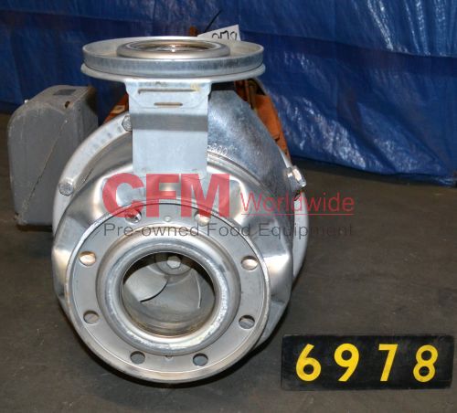 Goulds 3"x 4-8" G&L series SSH stainless steel centrifugal pump, catalog number 23SHKG, impeller diameter 6.687", 4" flanged product infeed, 3" flanged product discharge, 30 HP electric motor direct drive, 3510 RPM, wired 230/460/3/60, stainless steel contact.