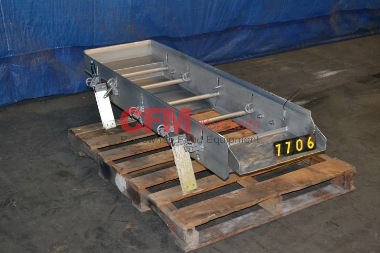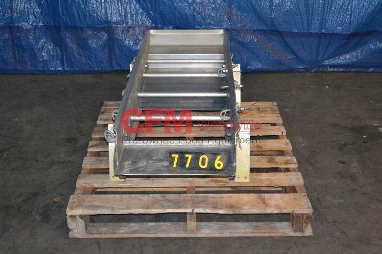 Key stainless steel shaker frame, 18" wide x 48" long x 3" deep screen area, 16-1/2" wide x 19" long discharge in center of shaker, 18-1/2" wide discharge at end of shaker, all stainless steel construction, requires screen, frame, motor, and shaker eccentric.