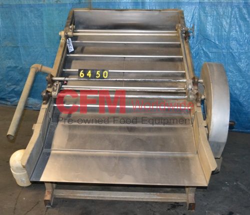 Olney model 1985 stainless steel destoner, serial number 212SC, 40" wide x 72" long, 2" tall slanted cleats every 6", 5 cleats in total, trash diversion gate to 54" wide x 17" long x 12" deep trough, 6" pipe discharge off of trough, all stainless steel construction.
