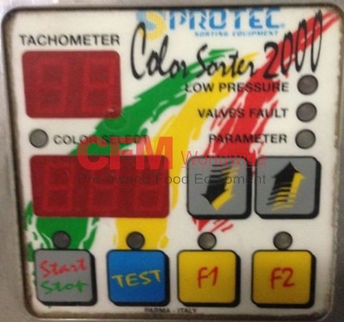 Protec model Dirt Hunter color sorting head, serial number 01022188B, 40" wide x 3-1/2" tall sensor area, type 40c, built 2001, 24 volt, 6 bar pressure, 120 liters a minute, with Protec Color Sorter 2000 controls, all stainless steel construction, requires CPU board.