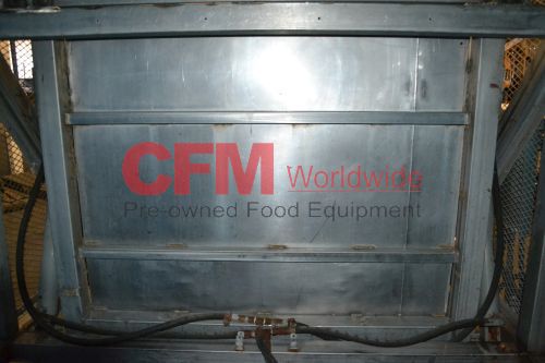 Stainless steel hydraulic bin dumper, capable of handling 52" wide x 46-1/2" tall maximum bins, 38" dump bay depth, 25" bin infeed height, 78" bin dumping height, stainless steel contact, stainless and mild steel construction, requires controls.