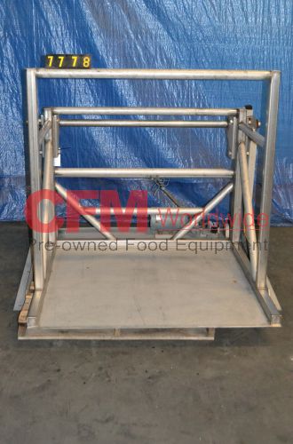 Stainless steel tote dumper, 46" wide x 46" long x 46-1/2" tall maximum bin size, floor level infeed, 46" bin dump height, all stainless steel construction, offered reconditioned with a power pack and new cylinders.